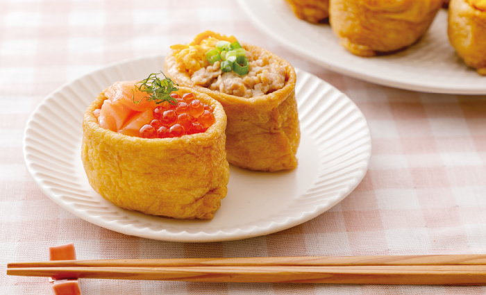- いなりずしにサーモンといくらを8等分ずつのせ、青じそをトッピングする。